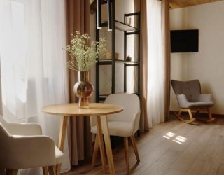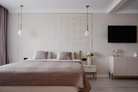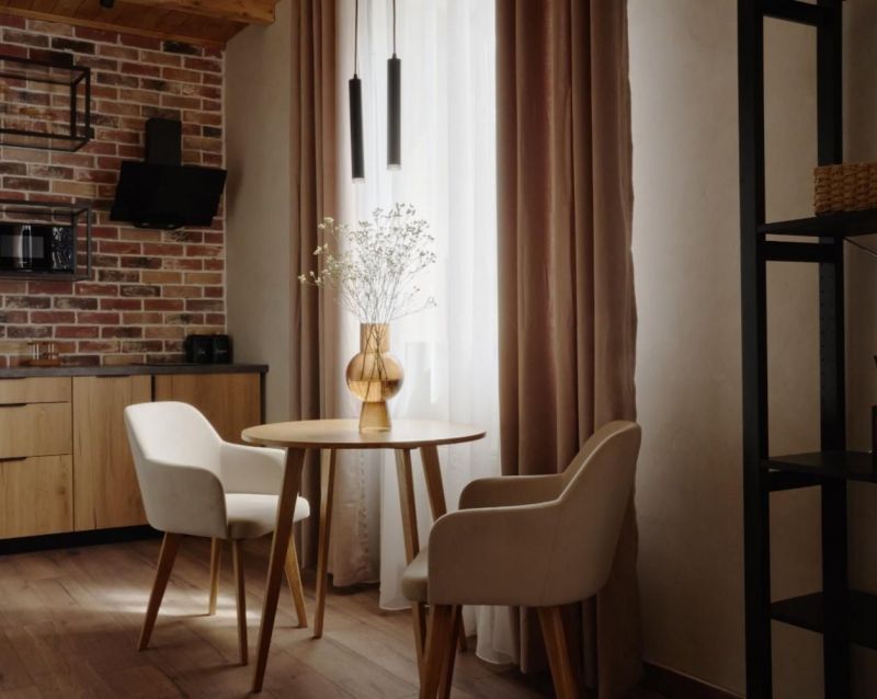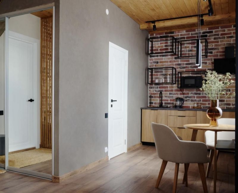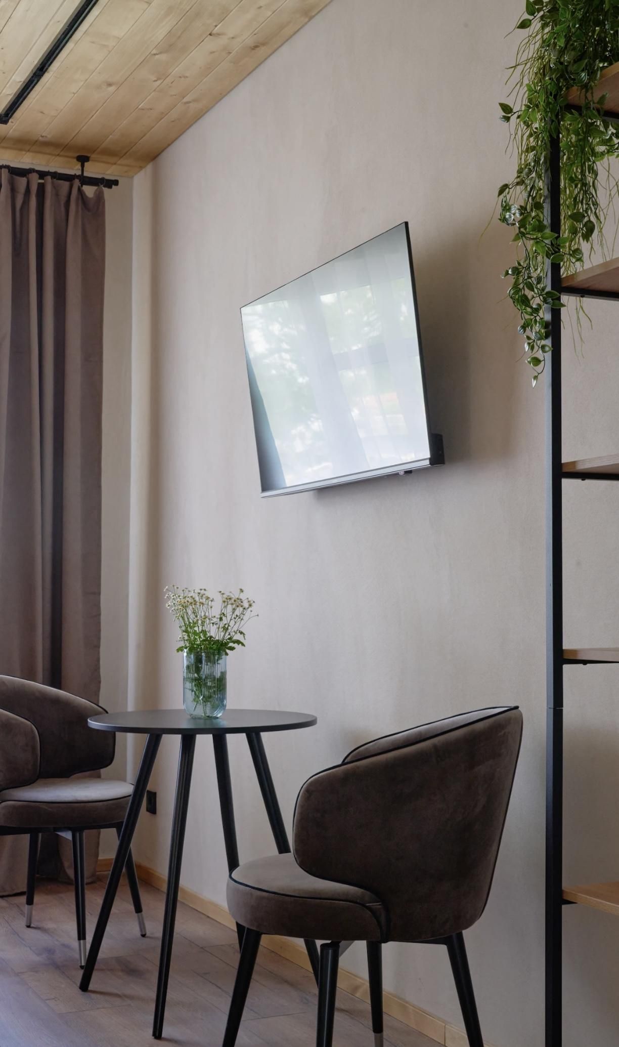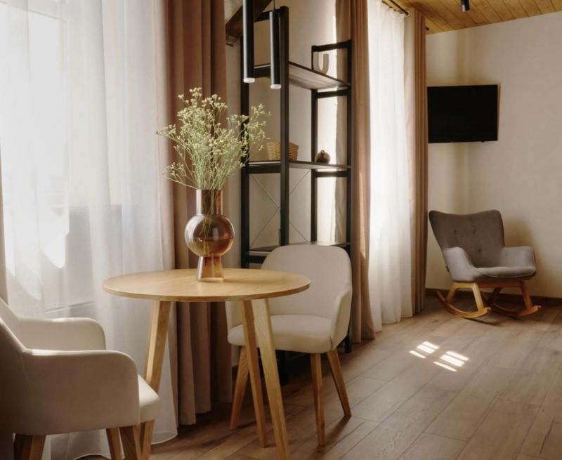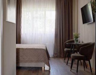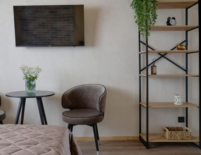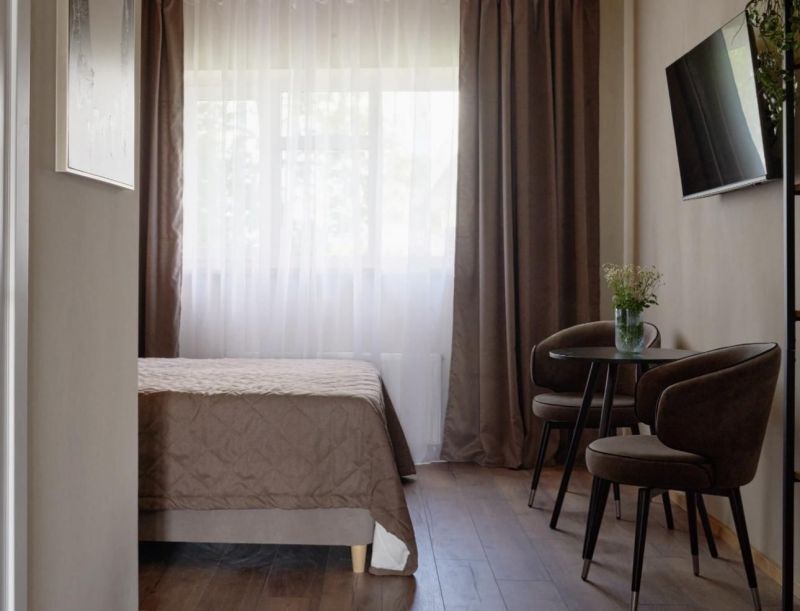 Жилой фонд включает стандартные номера, студии и апартаменты с кухней-гостиной. Все категории современно и атмосферно оформлены в приглушенных тонах, до мелочей продуманы и дополнены нетривиальными интерьерными деталями. В качестве спальных мест представлены различные типы кроватей — одно- и двуспальные, а также раскладные диваны. По запросу выдаются детский манеж или стульчик для кормления. В кухнях предусмотрено все, что может понадобиться при приготовлении блюд. В отеле доступны Smart TV и Wi-Fi. Заселение с питомцем возможно по предварительному согласованию. Припарковать автомобиль можно у корпуса.